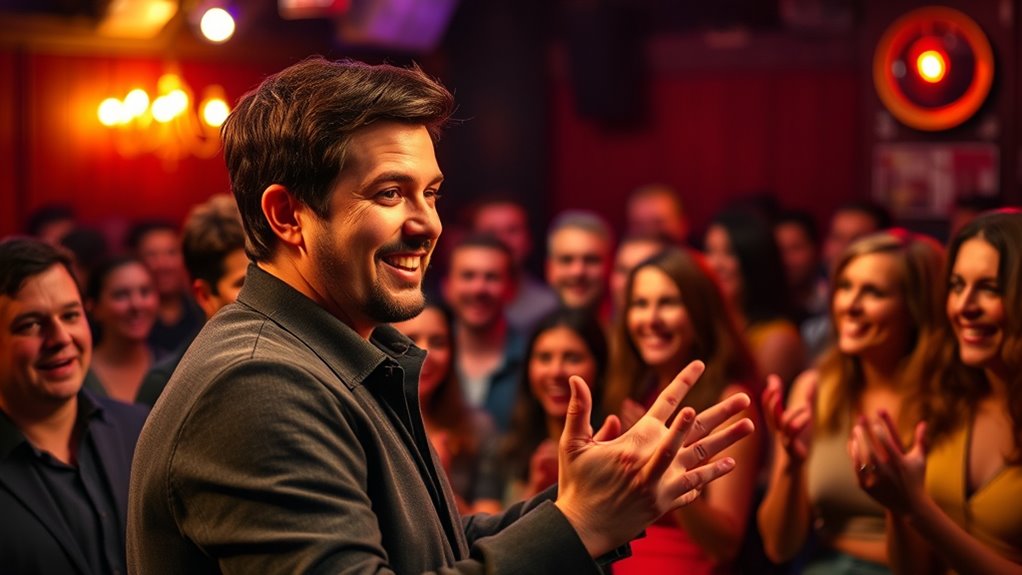 Audience engagement greatly influences your comedic timing because their reactions and social cues guide you on when to deliver punchlines. If they laugh or react quickly, you can speed up your delivery, while hesitation or silence signals you should pause or adjust. Paying attention to these cues helps you fine-tune your timing, making your jokes land better and ensuring your performance feels natural and connected to the audience’s energy.