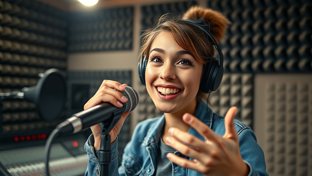 Sure, start with simple improv warm-ups like “yes, and” to build spontaneity. Practice scene improvisation by creating quick stories without overthinking—imagine you’re a superhero stuck in a grocery store. These exercises boost your adaptability and confidence on mic. Remember, the goal isn’t perfection but embracing mistakes as part of the fun. With consistent practice, you’ll find your voice acting naturally more vibrant and spontaneous.