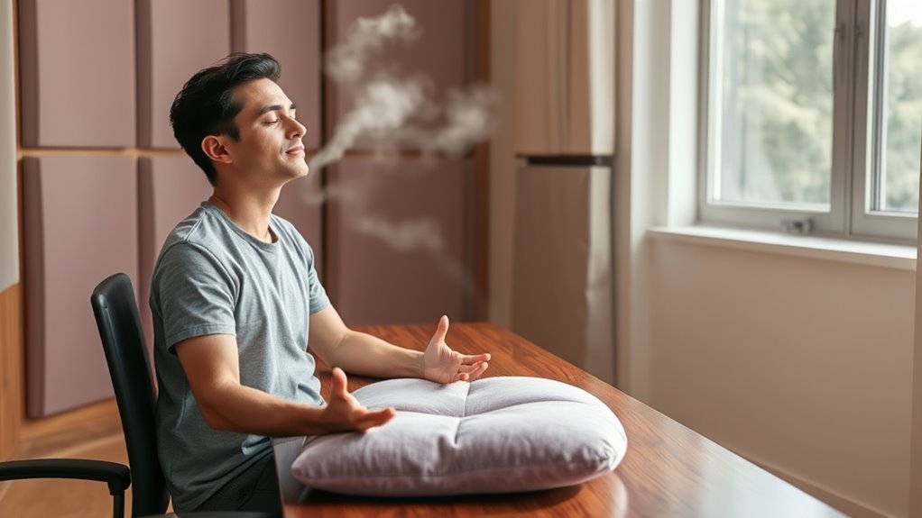 To reduce tension in voice acting, you can use meditation techniques to stay present and relax your body. Focus on slow, deep breaths to release stress and ease vocal strain. Pay attention to areas like your jaw, shoulders, and neck, and gently relax them. Incorporating mindfulness into your practice helps improve vocal control, authenticity, and emotional connection. If you continue exploring, you’ll discover more ways to harness meditation for a more resonant, tension-free voice.