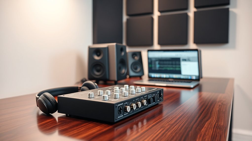 To select the right audio interface for your home studio, start by ensuring it matches your gear and recording needs, like guitar, microphone, or MIDI connections. Set a realistic budget and find a model with enough inputs and outputs for current and future projects. Check OS compatibility and consider portability if you move your setup often. If you explore further, you’ll discover key tips to help you make the best choice for your home studio setup.