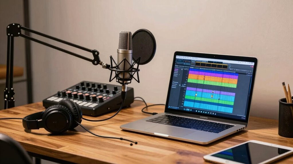 Once you’ve selected the right hardware, your focus should shift to mastering editing techniques that elevate your recordings. Even with a single interface, you can achieve studio-quality results by applying effective editing techniques. Start with noise reduction to eliminate background hums or static, making sure your voice remains prominent. Use equalization (EQ) to fine-tune frequencies; boosting the highs can add brightness, while lowering muddiness in the lows creates a cleaner sound. Compression is another essential tool—it helps control volume fluctuations, making your voice sound consistent and polished. These editing techniques, when applied thoughtfully, substantially improve audio quality without overprocessing.