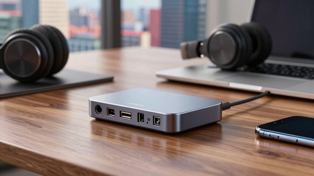 Think of your data as a treasure needing protection. Portable audio interfaces often use data encryption to guard your recordings, ensuring they stay private even during remote accessibility. While no system is foolproof, these security measures make unauthorized access difficult, giving you peace of mind. You can confidently record remotely, knowing your sensitive audio files are safeguarded through encryption and secure connections, much like a vault for your creative work.