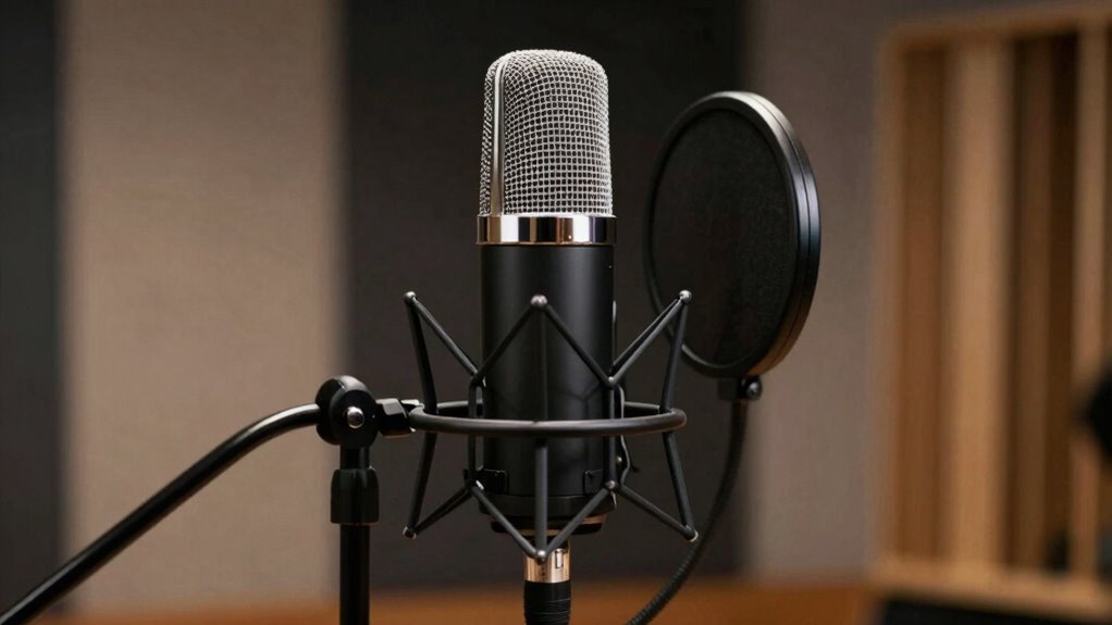 Think of your microphone as a musical instrument—you need the right accessories to make it sing. Essential items include a pop filter, which prevents plosive sounds from ruining your take, and a shock mount to eliminate vibrations and handling noise. Together, these accessories optimize your mic’s performance, ensuring crystal-clear recordings. Without them, even the best mic can fall flat; with them, your voice will truly shine.