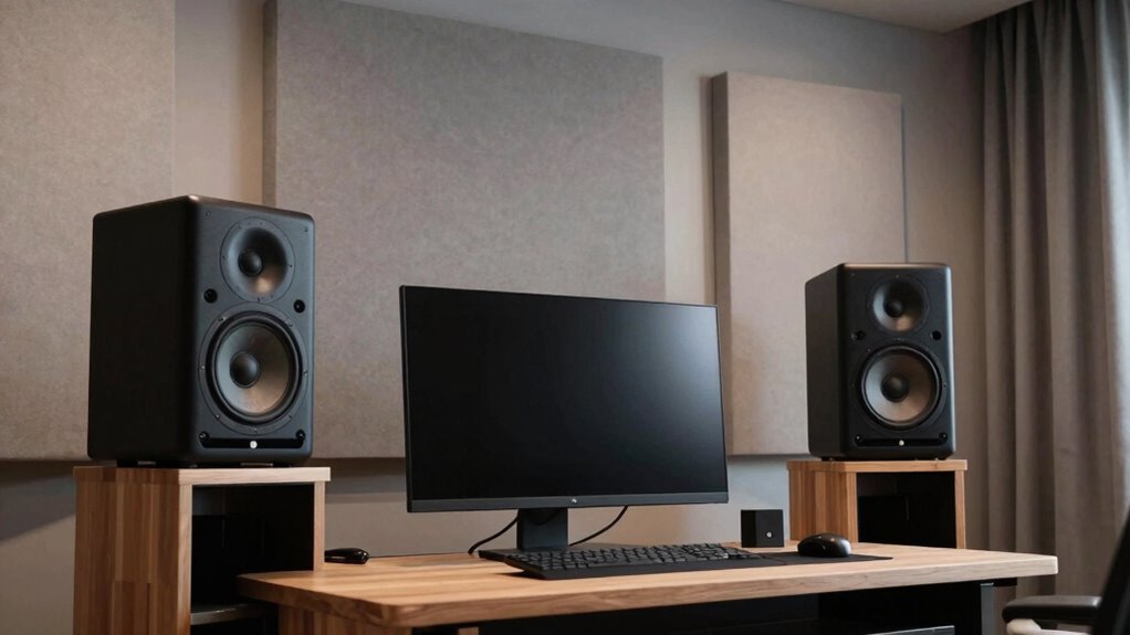 Speaker placement is equally critical. Even the best monitors can underperform if they’re not positioned correctly. You want to set them up at ear level, forming an equilateral triangle with your listening position. This ensures that sound reaches your ears directly, avoiding reflections from nearby surfaces that can muddy the audio. Keep the speakers at a reasonable distance from walls to prevent bass buildup and echo. Experiment with angles, aiming the tweeters toward your ears for maximum clarity. Proper placement helps you experience a balanced soundstage, which is essential whether you’re mixing tracks or just enjoying music casually. Additionally, understanding how room size influences speaker performance can help you select the appropriate monitors for your space. Considering speaker power and size can also prevent overloading or underperforming in your specific environment. To optimize your setup, it’s beneficial to learn about acoustic treatment, which can significantly improve sound accuracy and reduce unwanted reflections. Using room acoustics to your advantage can make a noticeable difference in sound clarity and overall listening experience.