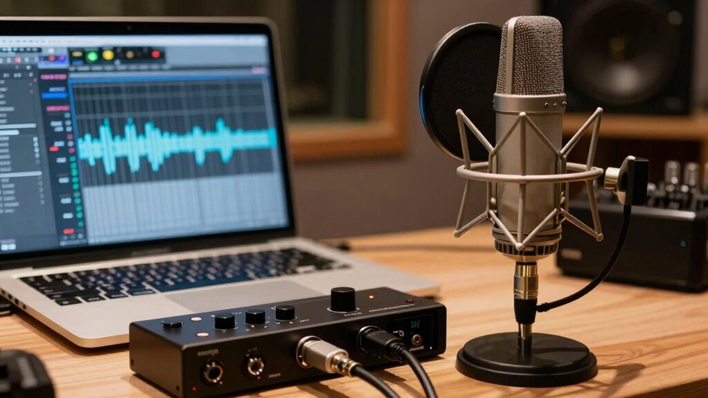 Thunderbolt generally offers faster data transfer and lower latency than USB, making it better suited for high-quality spoken word recordings, especially when using vintage microphones that demand precise audio capture. With Thunderbolt, you can minimize interference and guarantee cleaner sound, even with acoustic treatment in your studio. This results in a smoother workflow, clearer recordings, and less chance of dropouts, which is essential for professional-quality spoken word projects.